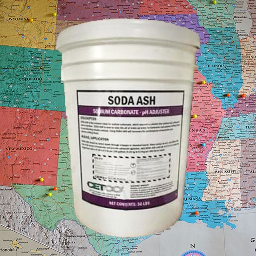 SODA ASH should be added slowly through a hopper or chemical barrel. When using a barrel, mix SODA ASH into a full barrel of freshwater and provide adequate agitation. Add SODA ASH until pH of 8.5-9.5 is obtained. Suggested ratio is 0.33 to 0.5 lb per 100 gallons (0.25 kg to 0.5 kg per 380 liters) water.