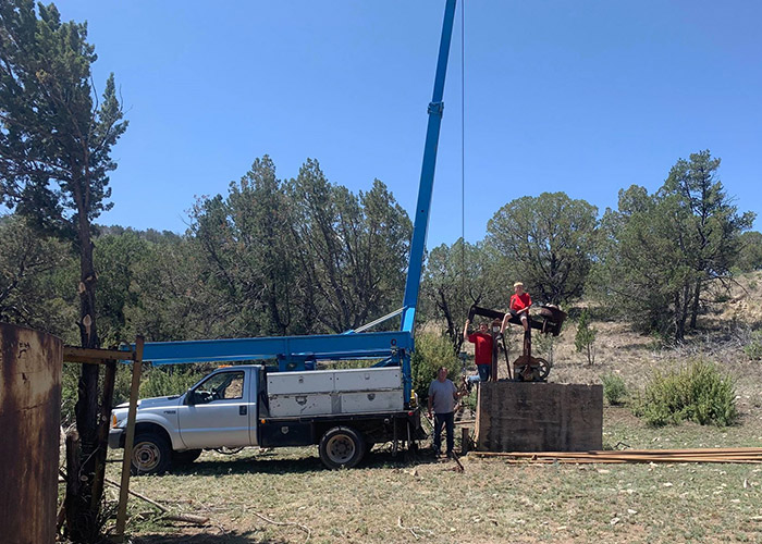 The 12,000 lb. capacity 5T is the most popular pump hoist.  It is extremely versatile with capabilities ranging from small submersible pumps all the way up to line shaft turbines.  Fast and easy setup by means of a self supporting mast with two 3 1/2″ bore hydraulic cylinders.  A guy cable is not needed in most situations.  Designed to allow for easy access to hard-to-get-to pumps and windmills.  The 5T is designed to mount on 1 ton or larger truck.  Weight is approximately 2,400 lbs.