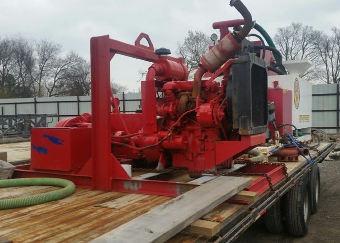 Also mounted on this gooseneck trailer is a 3X4X13 Centrifugal mud pump powered by a Detroit Diesel. Â This self-contained, skid mounted mud pump includes a separate diesel tank and control system from the mud cleaning system.